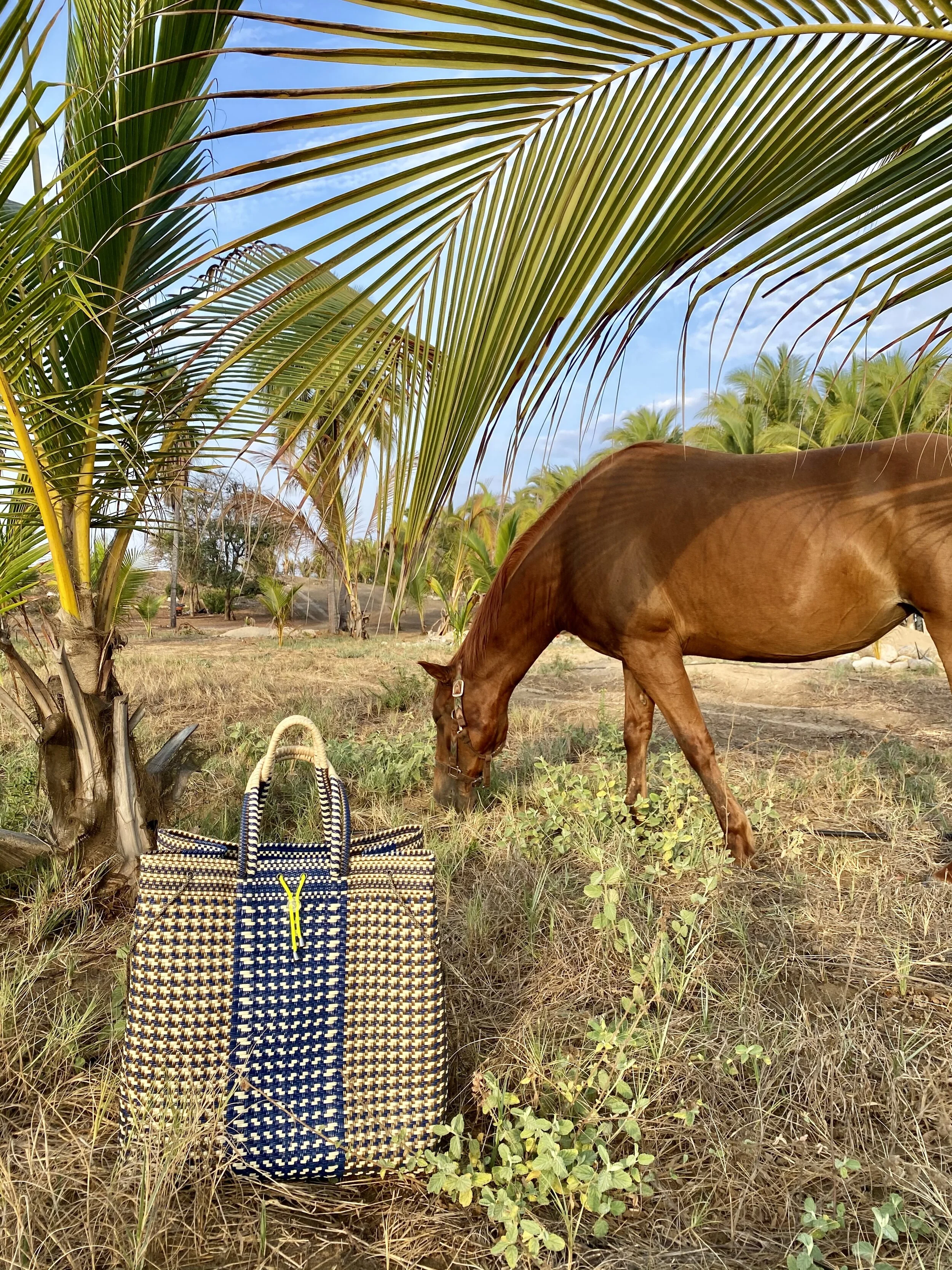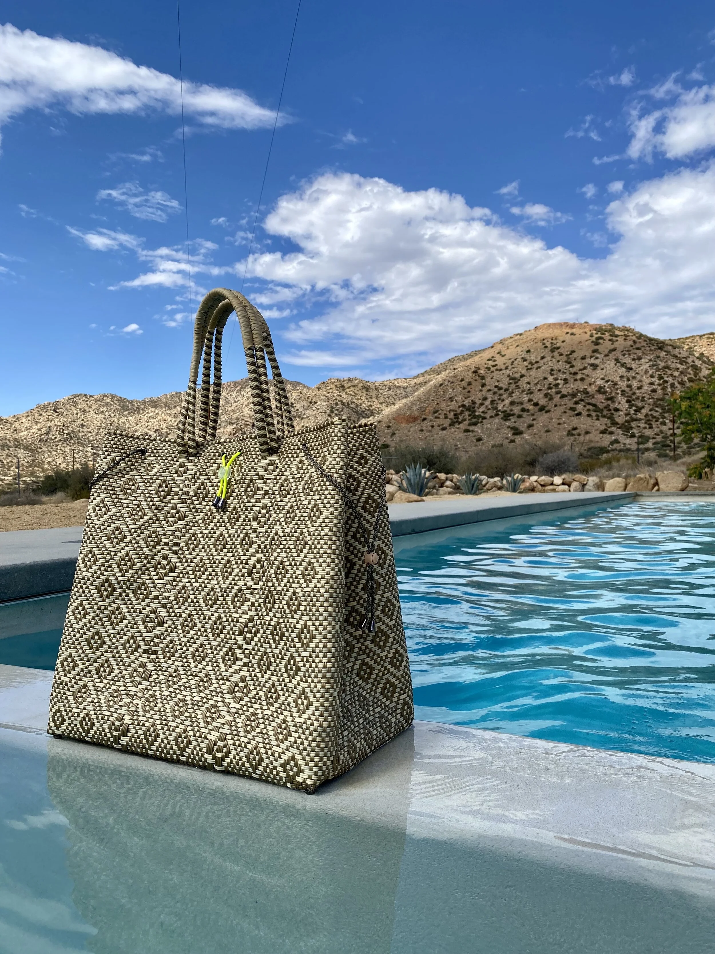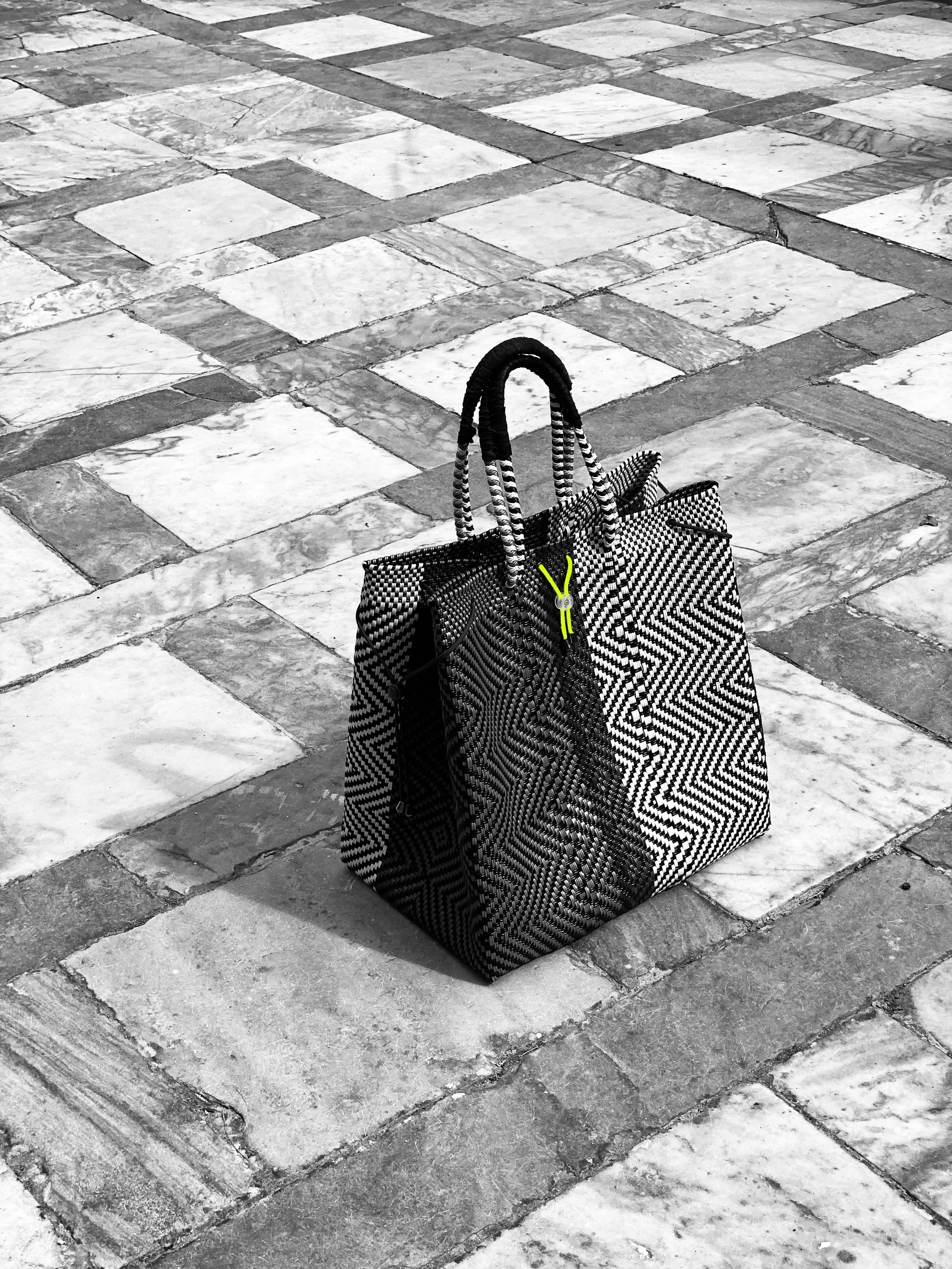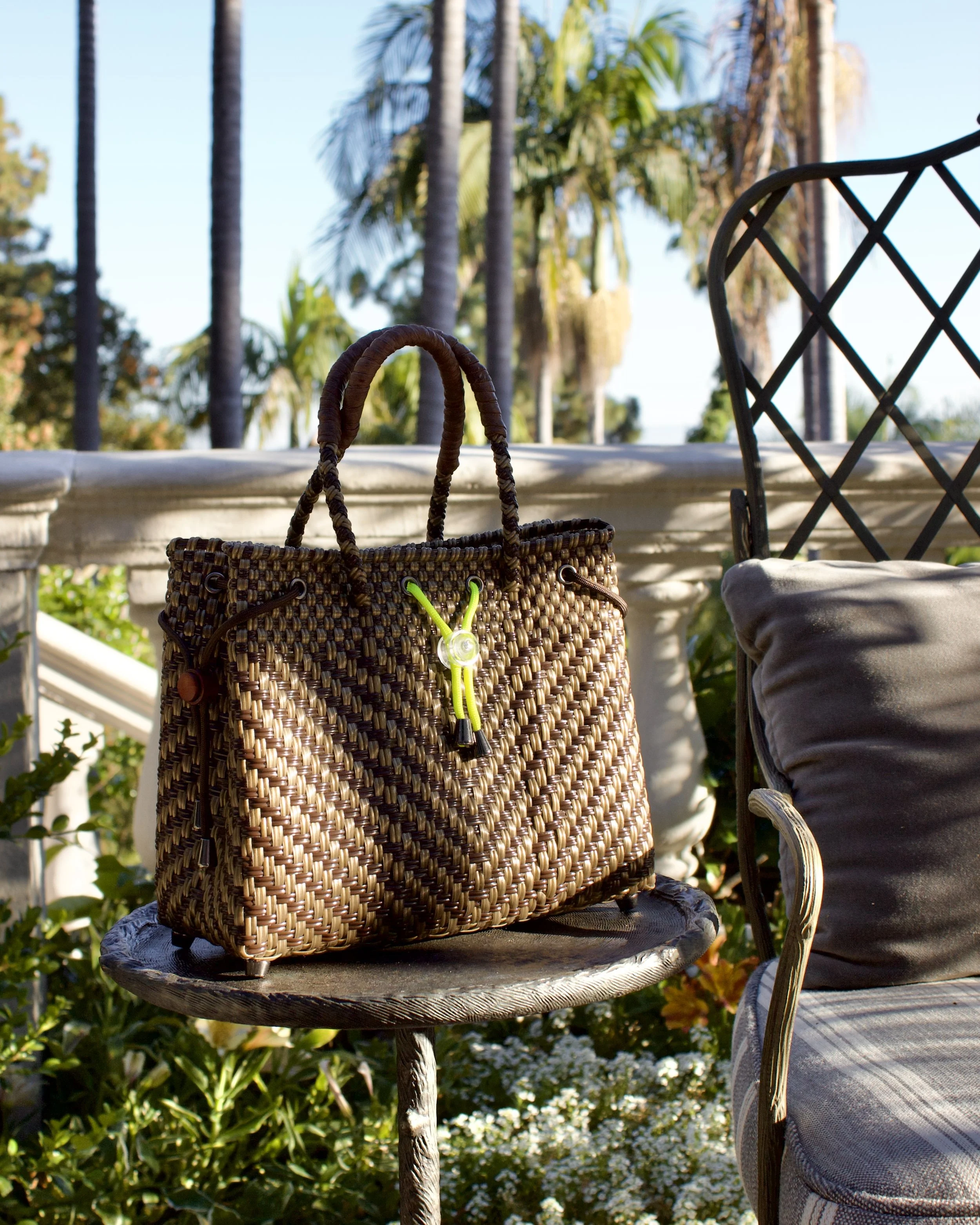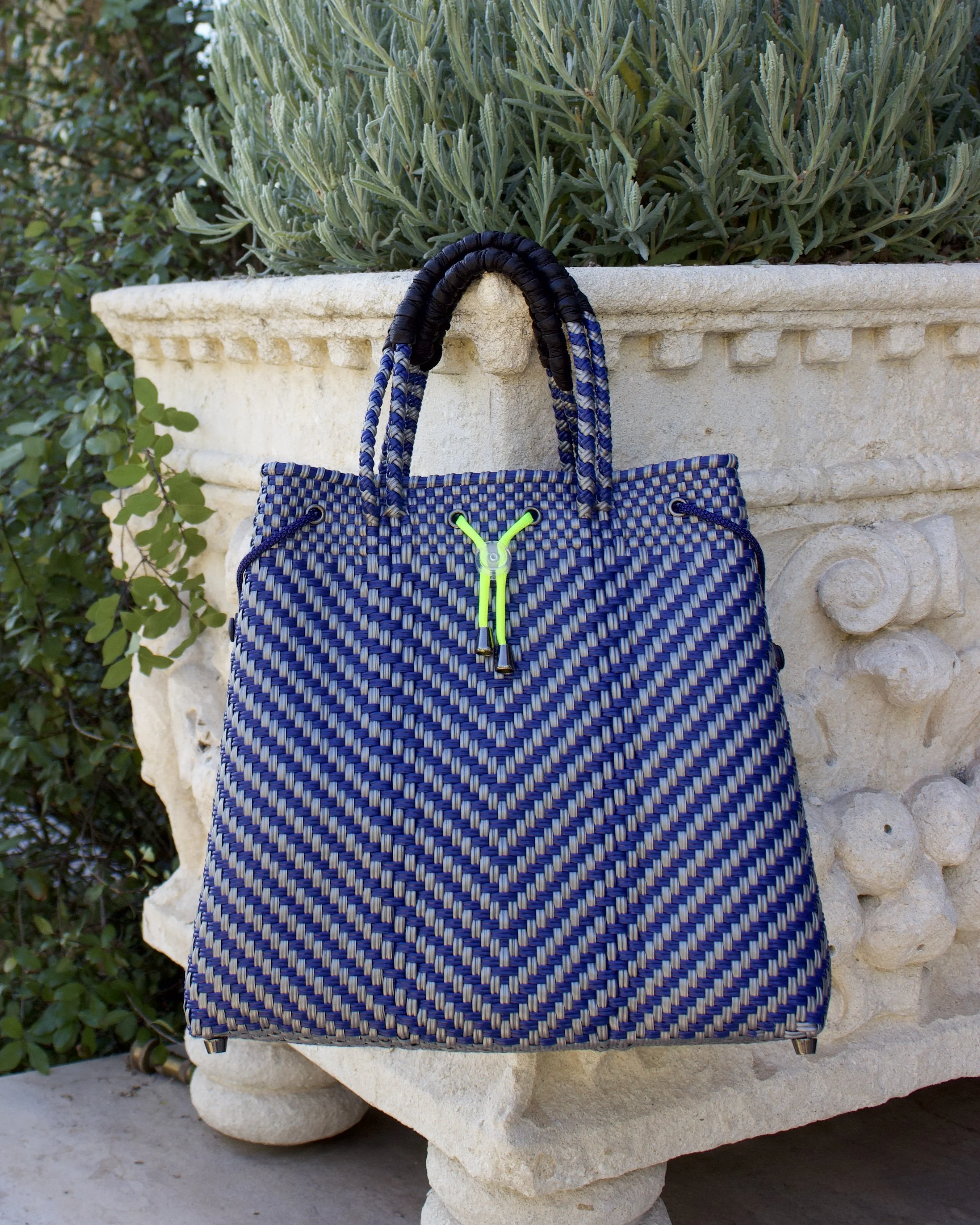 Fabricated of recycled PET plastic in the State of Oaxaca, Mexico, our Vita Nova Collection represents a story of metamorphosis. Common plastic vessels, like water bottles and food containers, are transformed into long colored lanyard. Handwoven by inmates throughout local jails, each bag is unique and no two bags are identical. Detainees are able to support their families by earning a fair wage for their work, transforming home life for their loved ones and children. In Los Angeles, leather is braided at the handles for a comforting grip. Durable nylon cords, with metal aglets and round spring cord locks, are added for an accordion closure. With metal feet and unlined for durability, The Vita Nova Collection can support you to do All The Things.